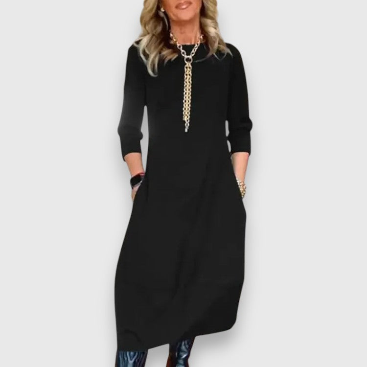This dress impresses with its simple elegance and clear lines that accentuate a feminine silhouette. The mid-length design with three-quarter sleeves provides a modern look, while the loose fit guarantees maximum comfort. Ideal for business, leisure, or festive occasions – a true all-rounder in your wardrobe.